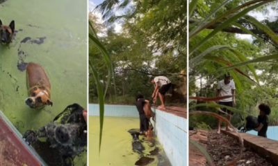 Um vídeo que circula nas redes sociais mostra o momento em que dois jovens resgatam três cães que haviam caído em uma piscina cheia de lodo...