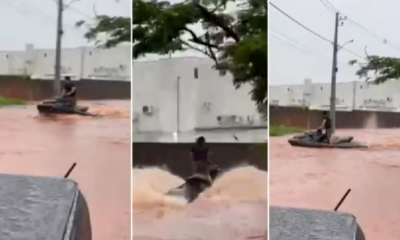 Um vídeo que circula nas redes sociais nesta quarta-feira (25) mostra, supostamente, um morador utilizando uma moto aquática em meio às ruas alagadas de Araguaína, no...